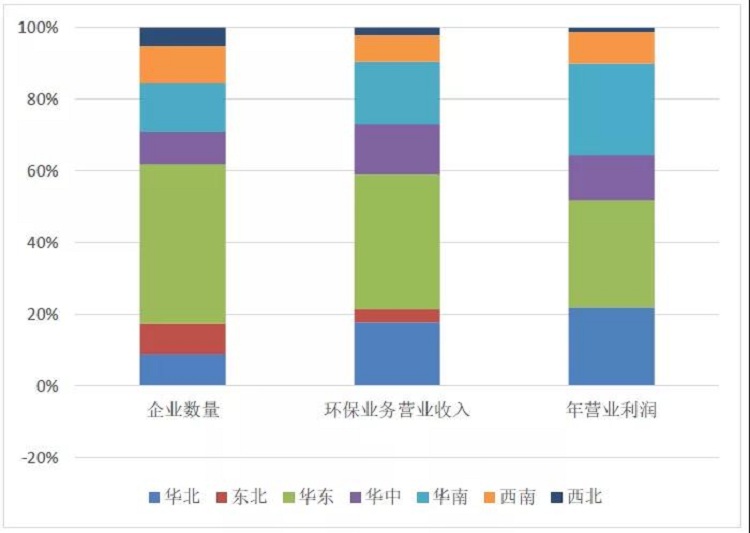 統(tǒng)計(jì)范圍內(nèi)有約45%的企業(yè)集聚于華東地區(qū),該地區(qū)貢獻(xiàn)了全國38%的環(huán)保營收,吸納了37%的從業(yè)人員。其次為華南地區(qū),以14%的企業(yè)數(shù)量占比貢獻(xiàn)了18%的環(huán)保營收,吸納了19%的從業(yè)人員。華北、華中、華南地區(qū)人均營業(yè)收入均高于全國平均值(105.2萬元/人)。華東、西南、西北、東北地區(qū)則低于全國平均水平。2020年數(shù)據(jù)顯示,廣東、北京、湖北、浙江、江蘇、山東6 ?。ㄊ校┢髽I(yè)營收總額均超過 1000 億元,6 省(市)環(huán)保企業(yè)營收總額,占全國的占比超過了 2/3。長江經(jīng)濟(jì)帶 11 ?。ㄊ校┮?36.7%的企業(yè)數(shù)量占比貢獻(xiàn)了近一半的產(chǎn)業(yè)營收。